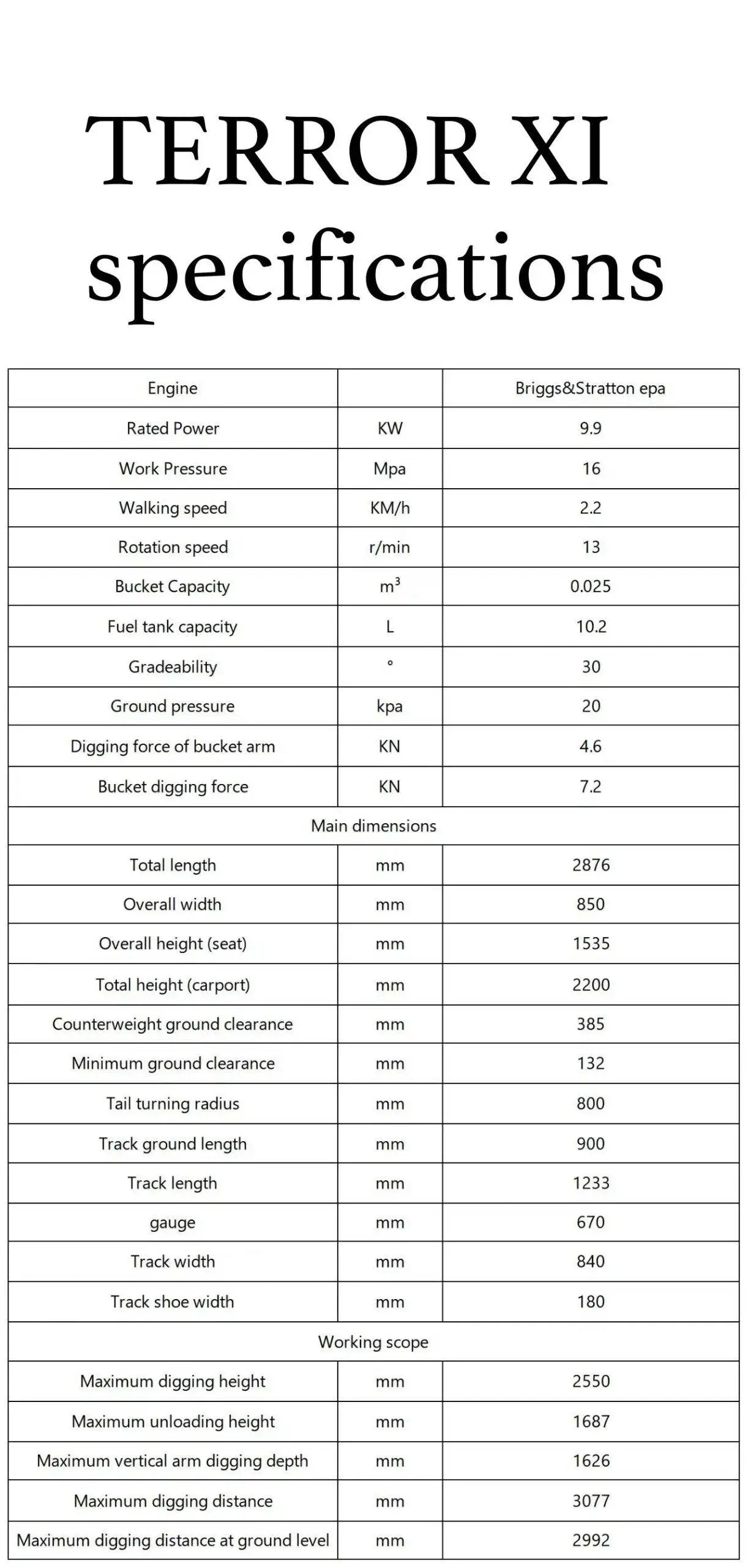 - 0.025 cbm bucket and platform ground clearance allow easy operation for all excavation, drilling, or bull-dozing jobs.